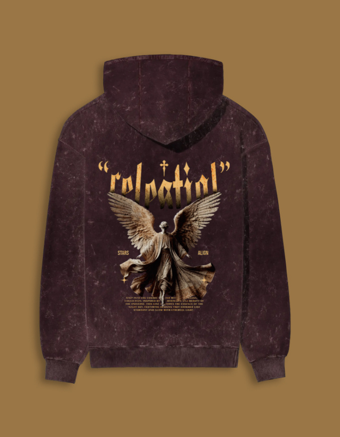 Elevate your streetwear game with the “Celestial” Acid Wash Hoodie — a unisex statement piece that blends cosmic energy with vintage street style. The hoodie features an intricate angelic graphic with grand wings and the bold “Celestial” text in distressed gold tones, symbolizing power, balance, and divine light.