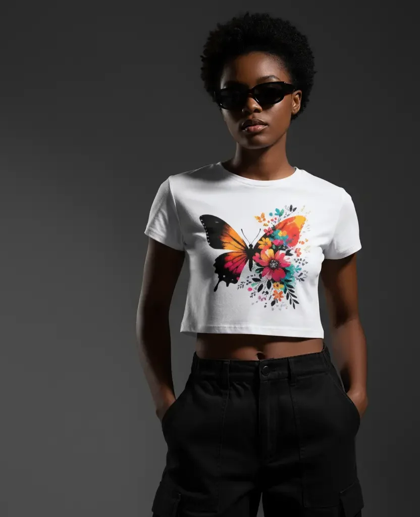 Brighten up your little one’s wardrobe with this stunning girls’ baby tee featuring a vibrant butterfly and floral design. The mix of bold rainbow colors and delicate flowers creates a stylish, artistic aesthetic perfect for casual wear, playdates, or gifting. Soft, comfy, and fashion-forward, this butterfly flower t-shirt is a must-have for every baby girl’s trendy outfit collection.